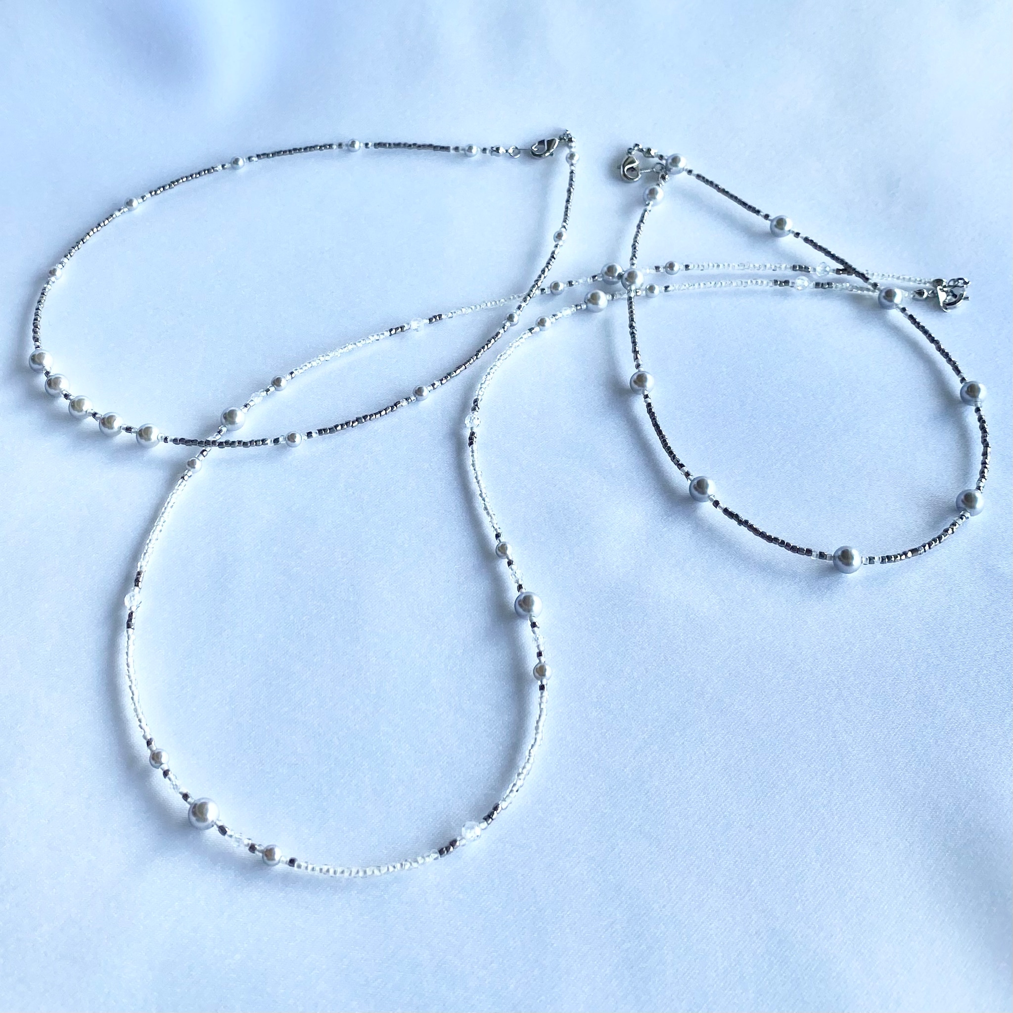 シルバーカラーのクールなビーズアクセサリーの3点です。