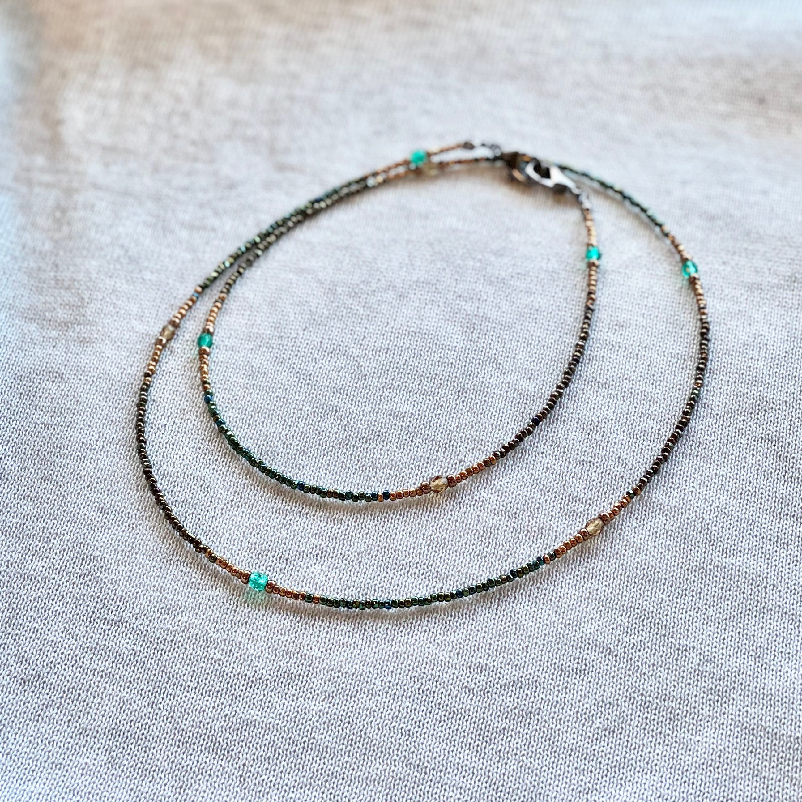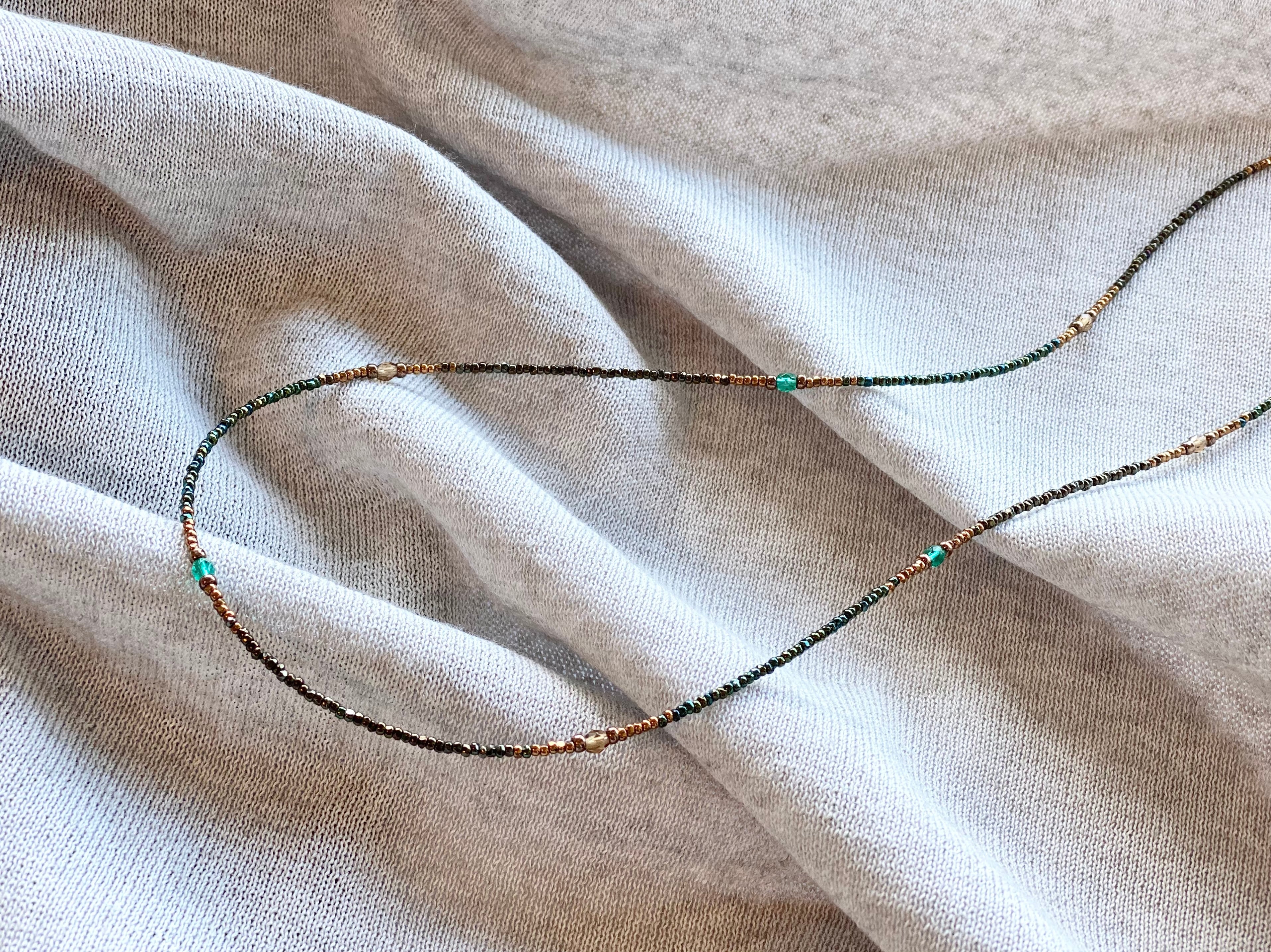 エメラルドグリーンとスモーキーブラウンのチェコガラスを散りばめて。
