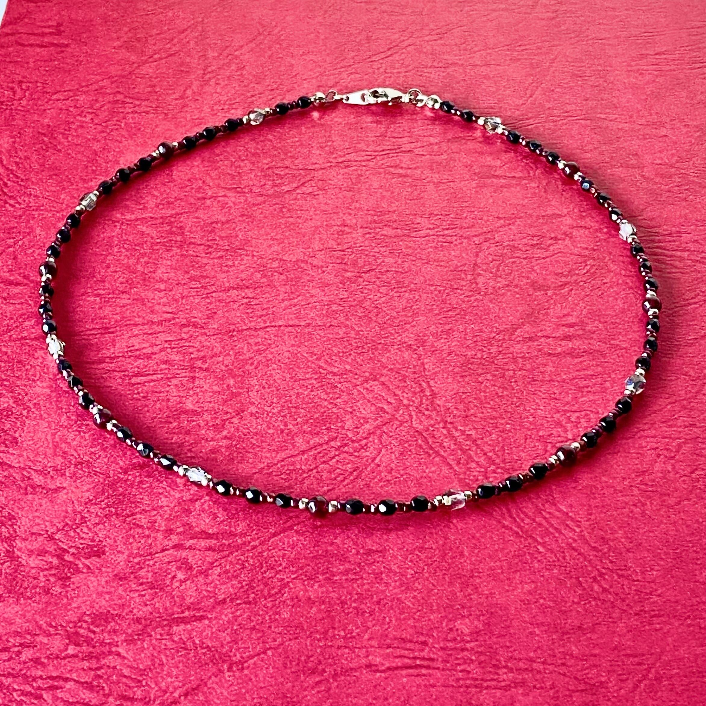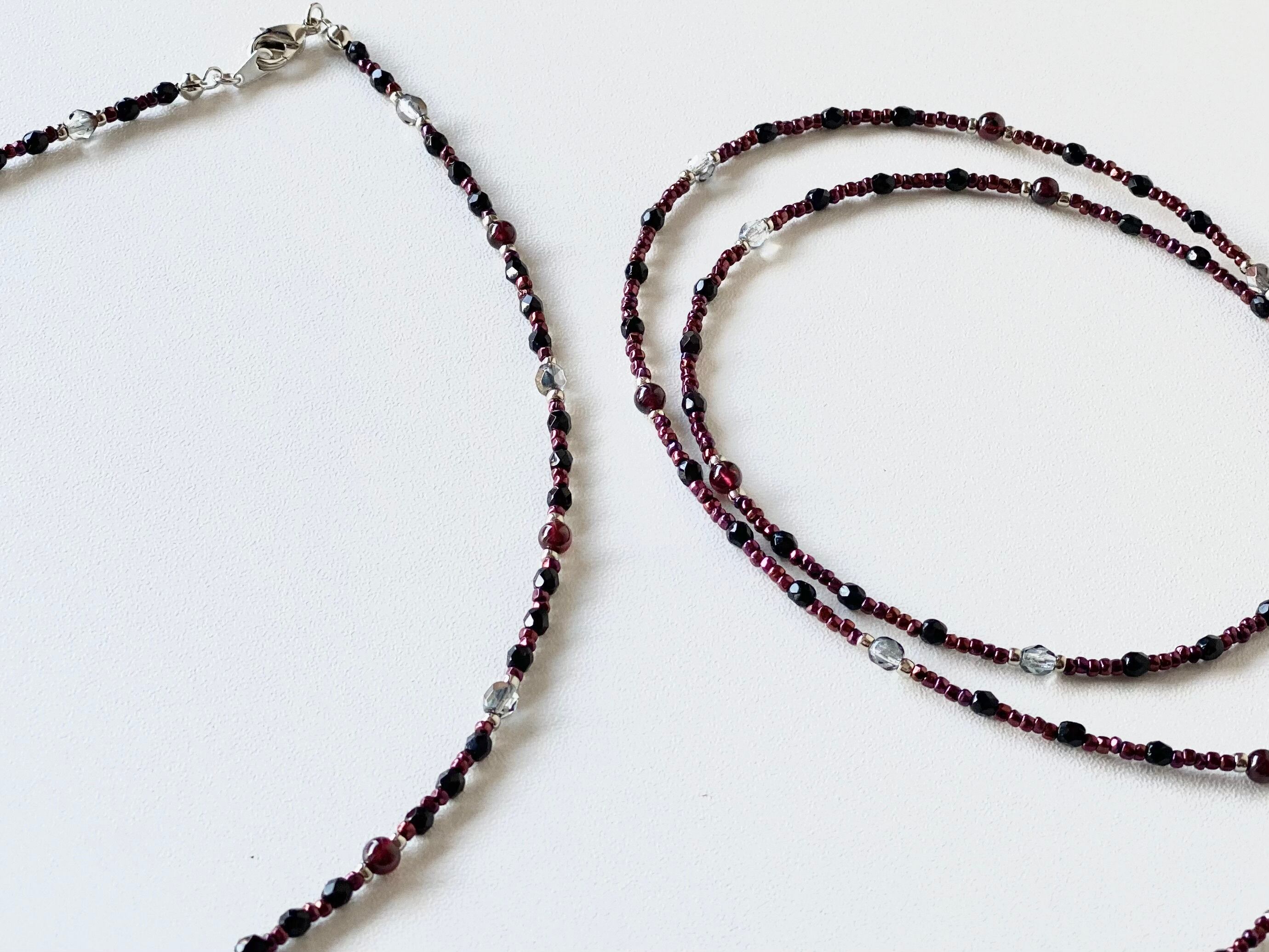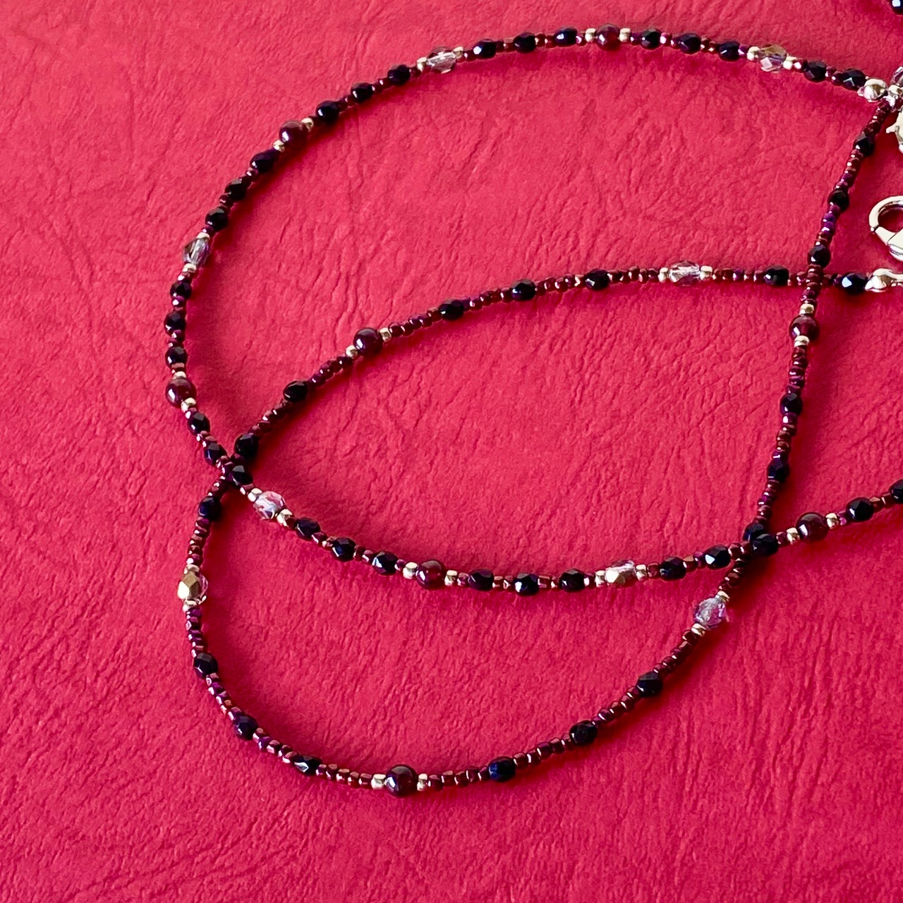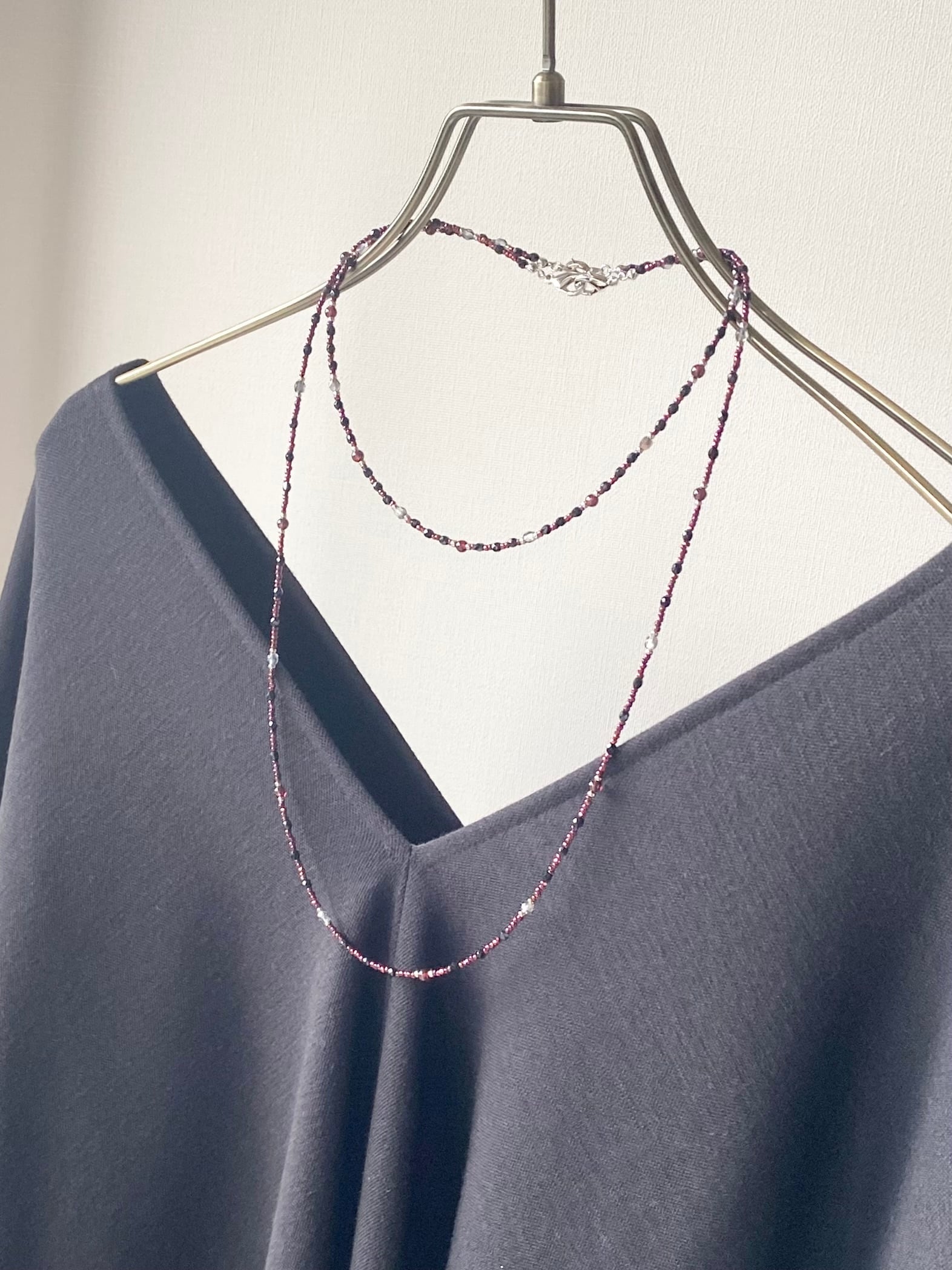 素材:天然石(ガーネット4mm)グラスビーズ メタルビーズ ナイロンコートワイヤー 留金具