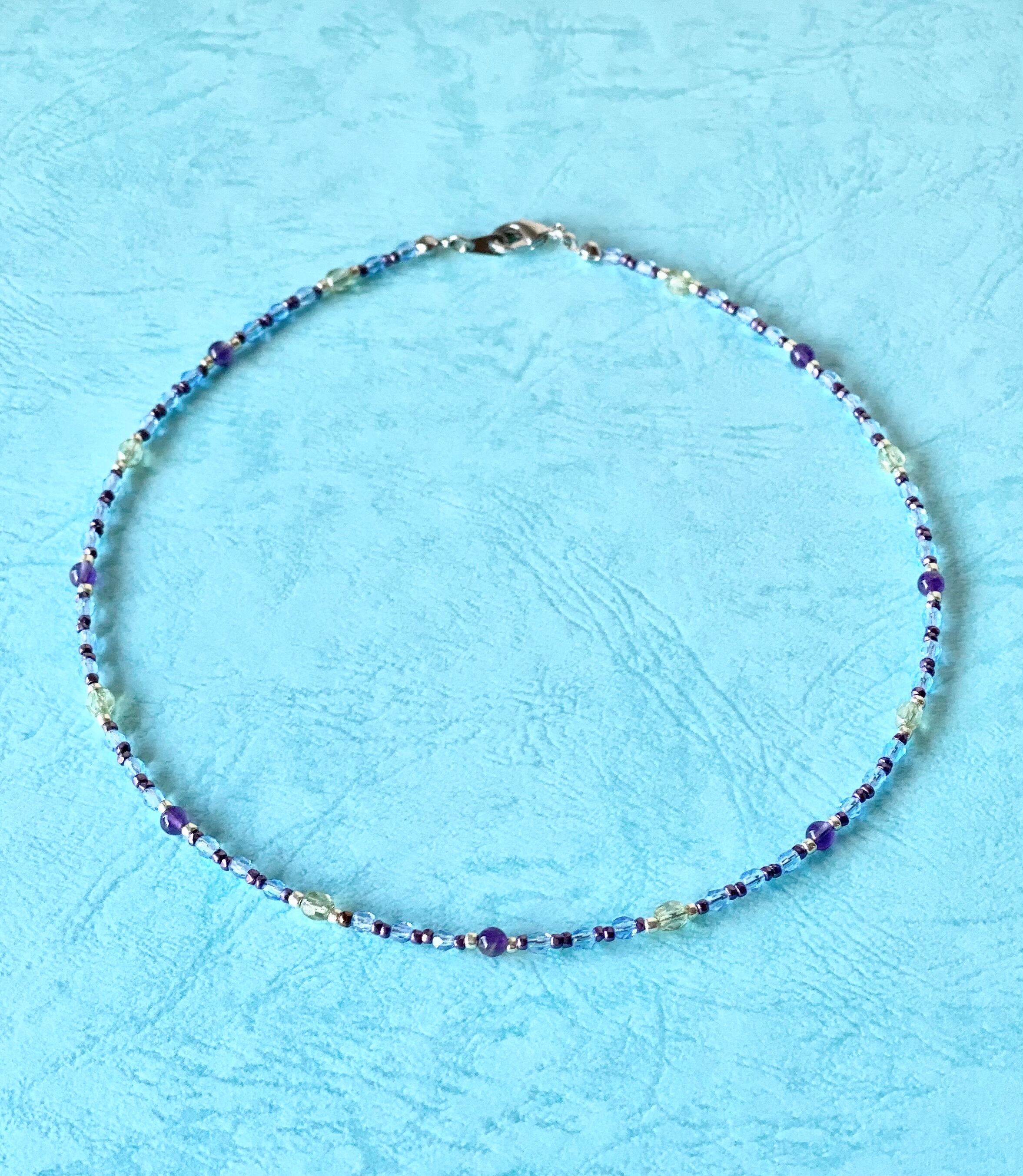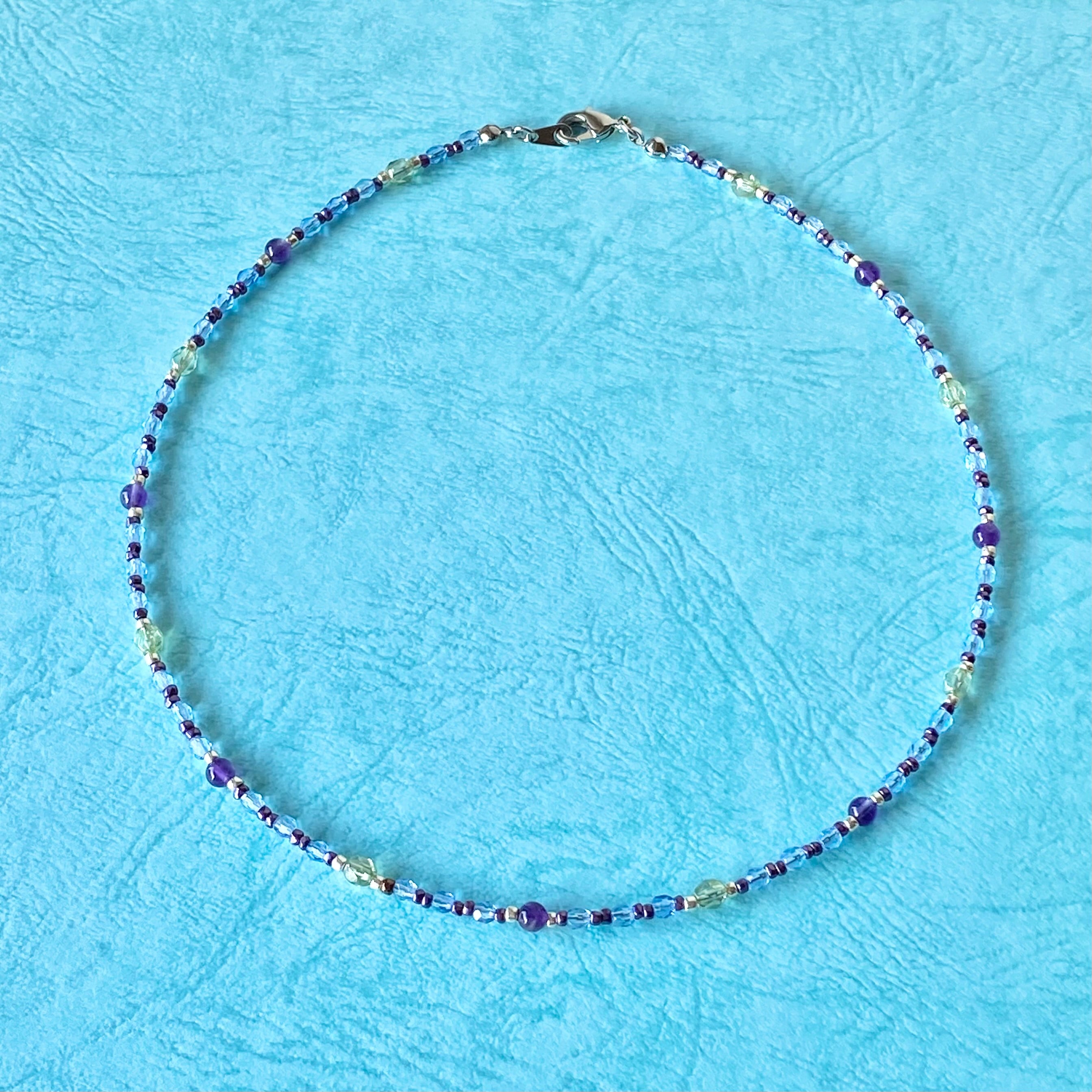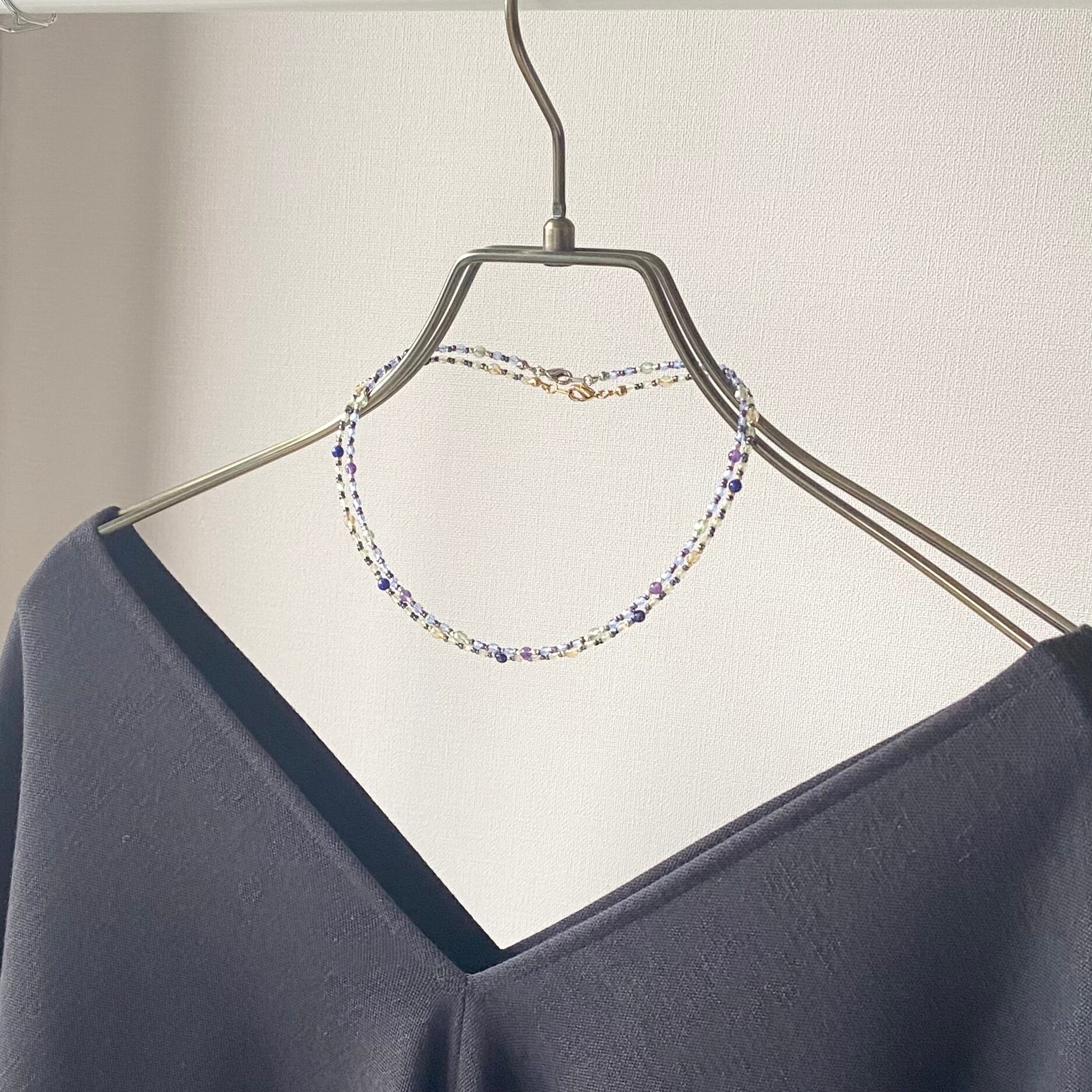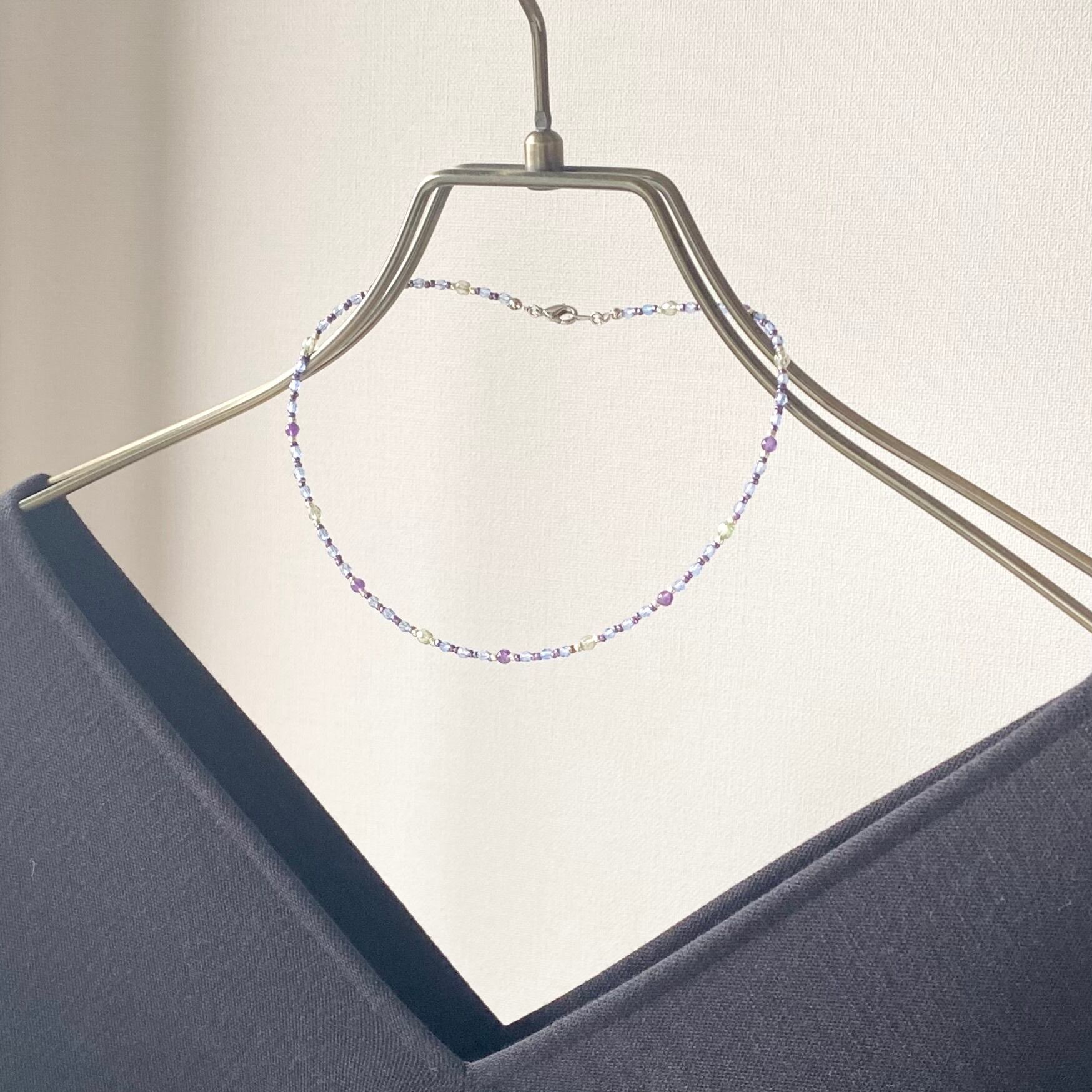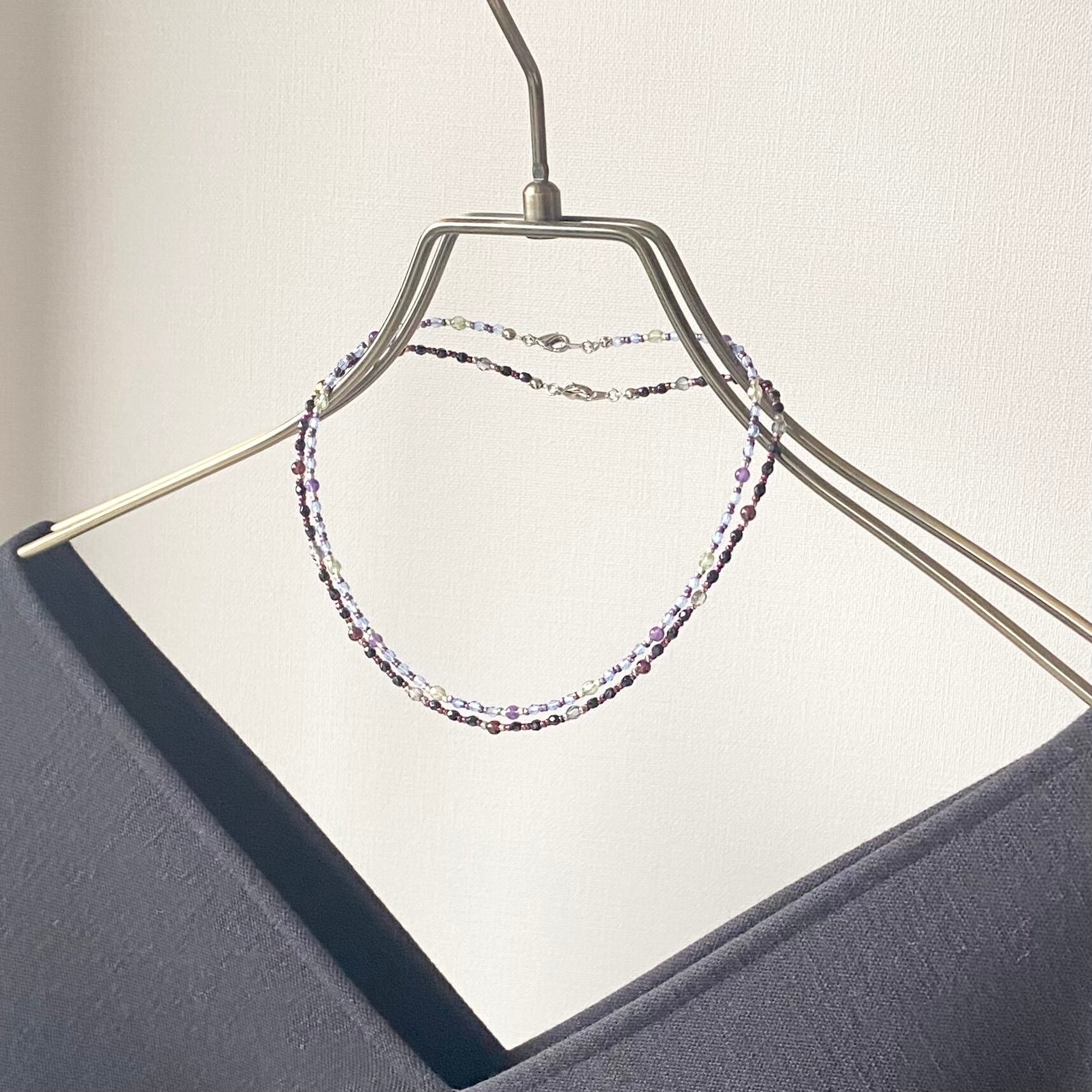 素材:天然石(アメシスト4mm)グラスビーズ メタルビーズ ナイロンコートワイヤー 留金具