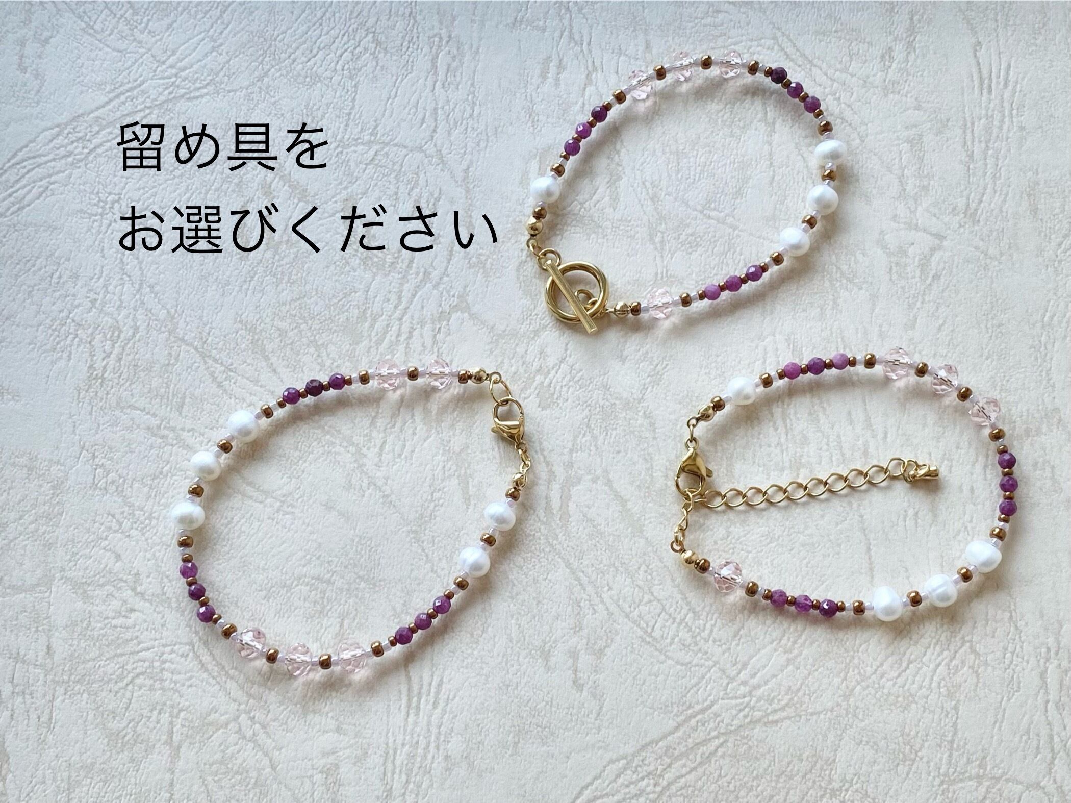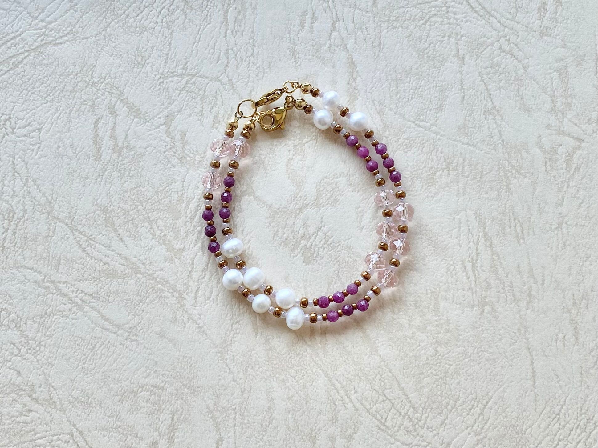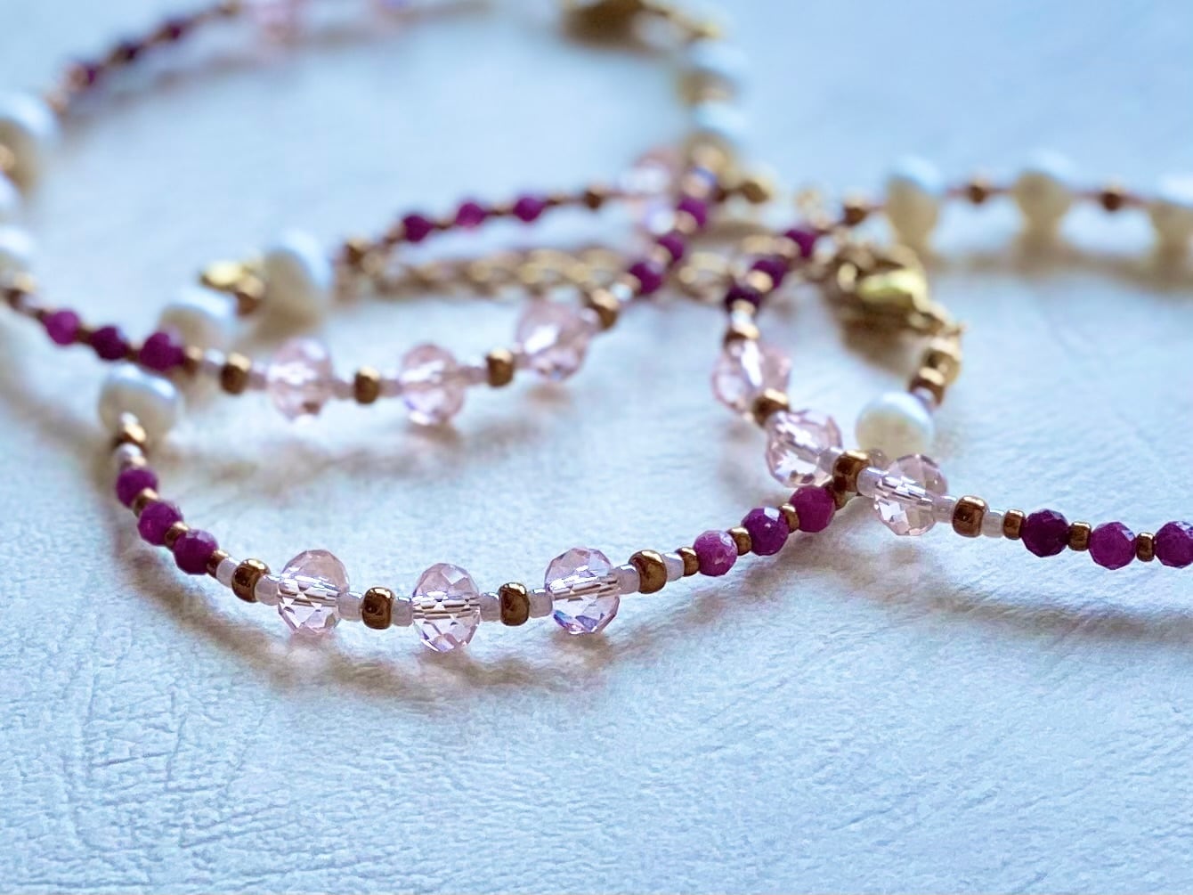 素材:天然石(ルビー、淡水パール)グラスビーズ ナイロンコートワイヤー 留金具(ステンレス、合金)