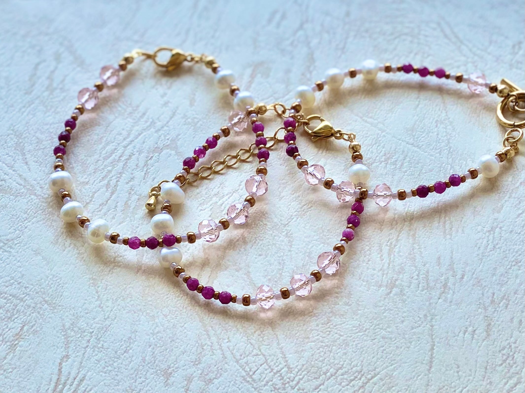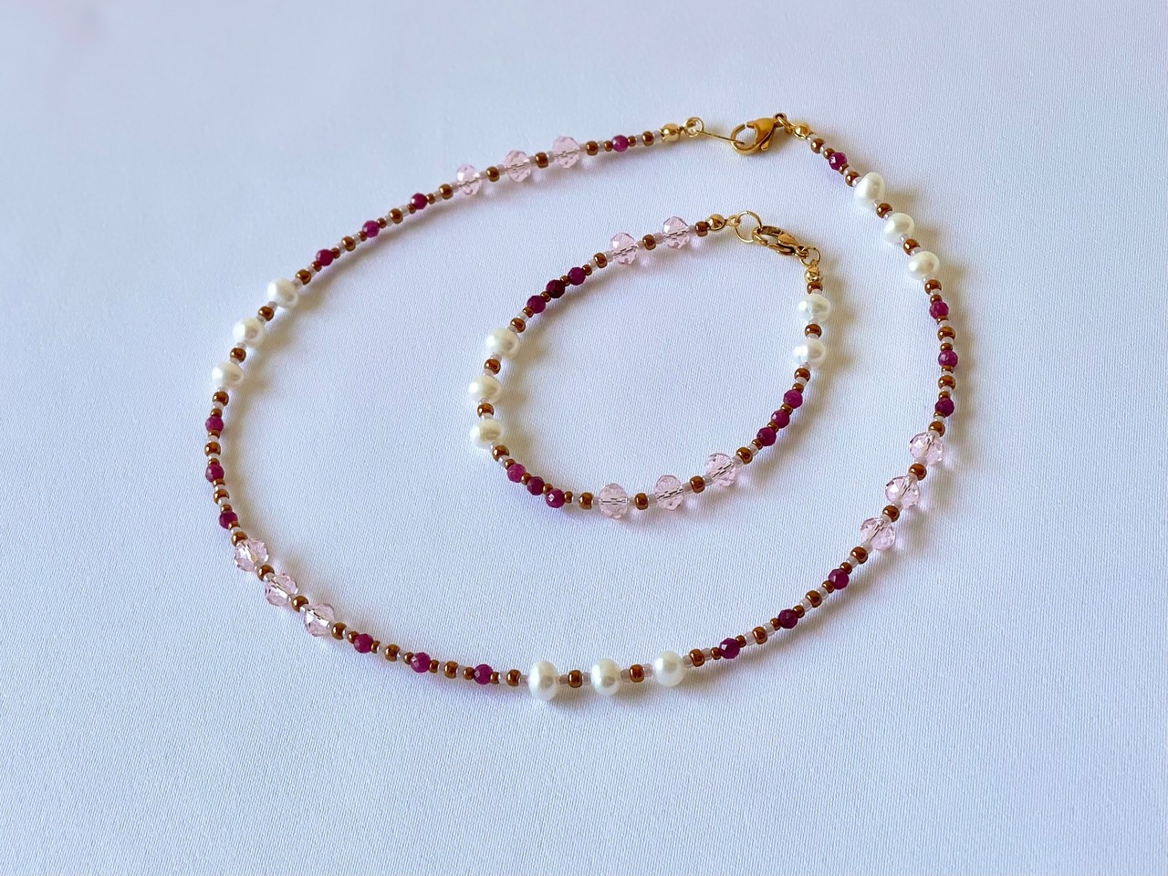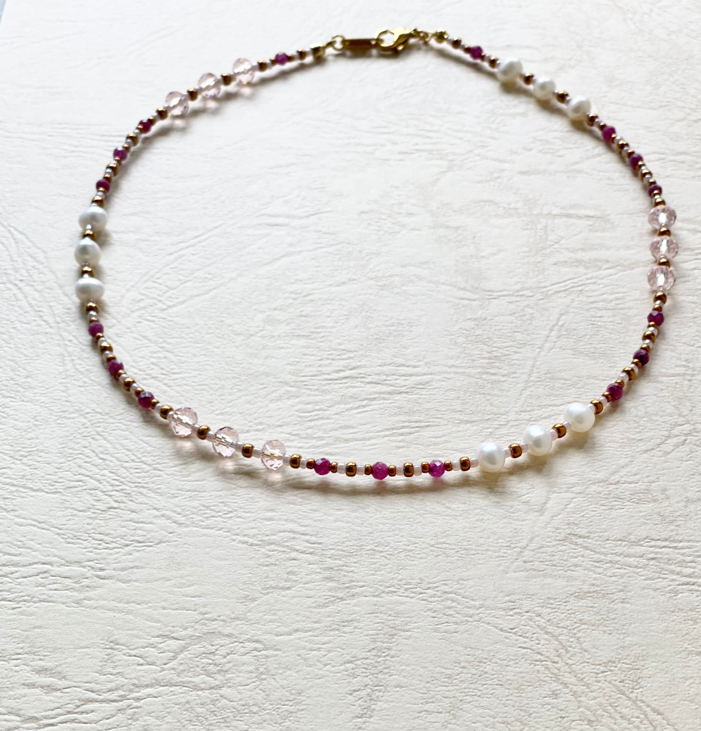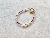 素材:天然石(ルビー、淡水パール)グラスビーズ ナイロンコートワイヤー 留金具(ステンレス、合金)