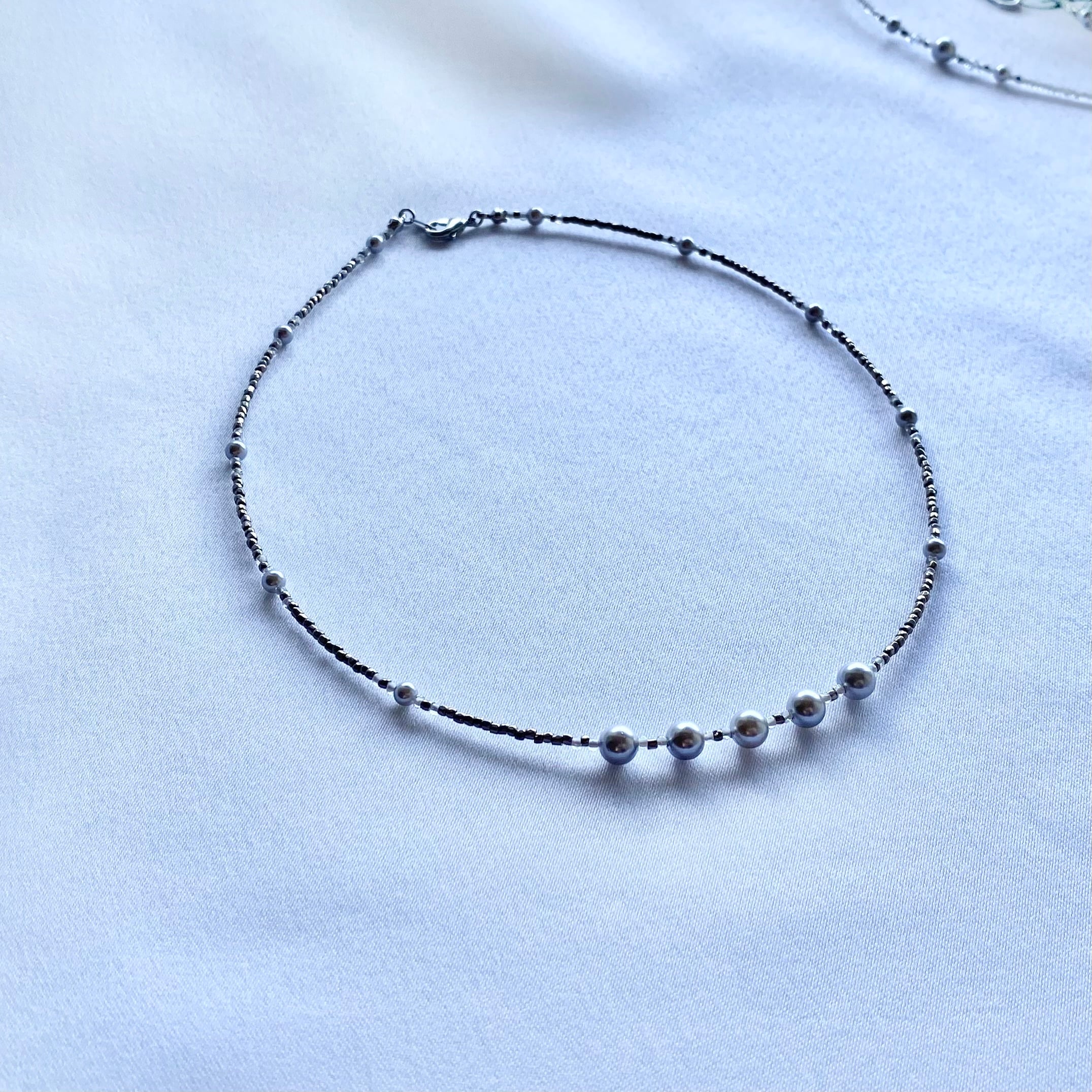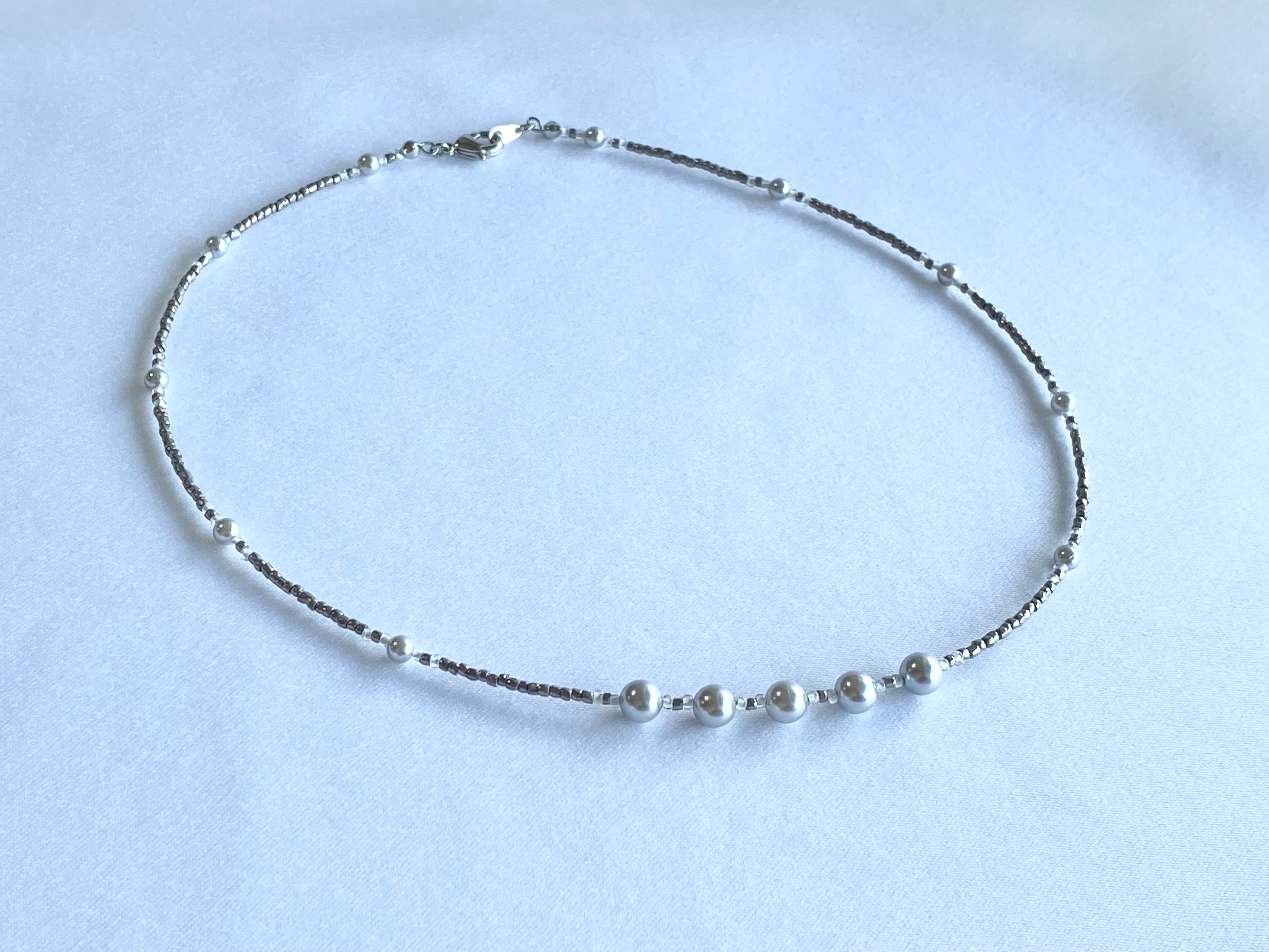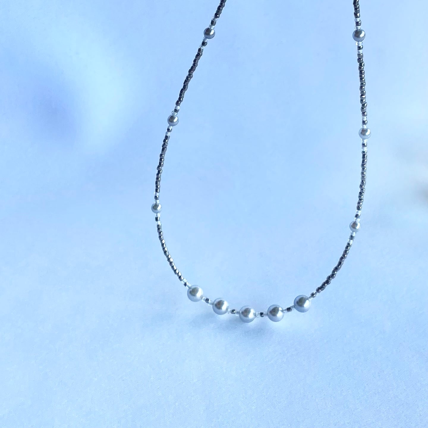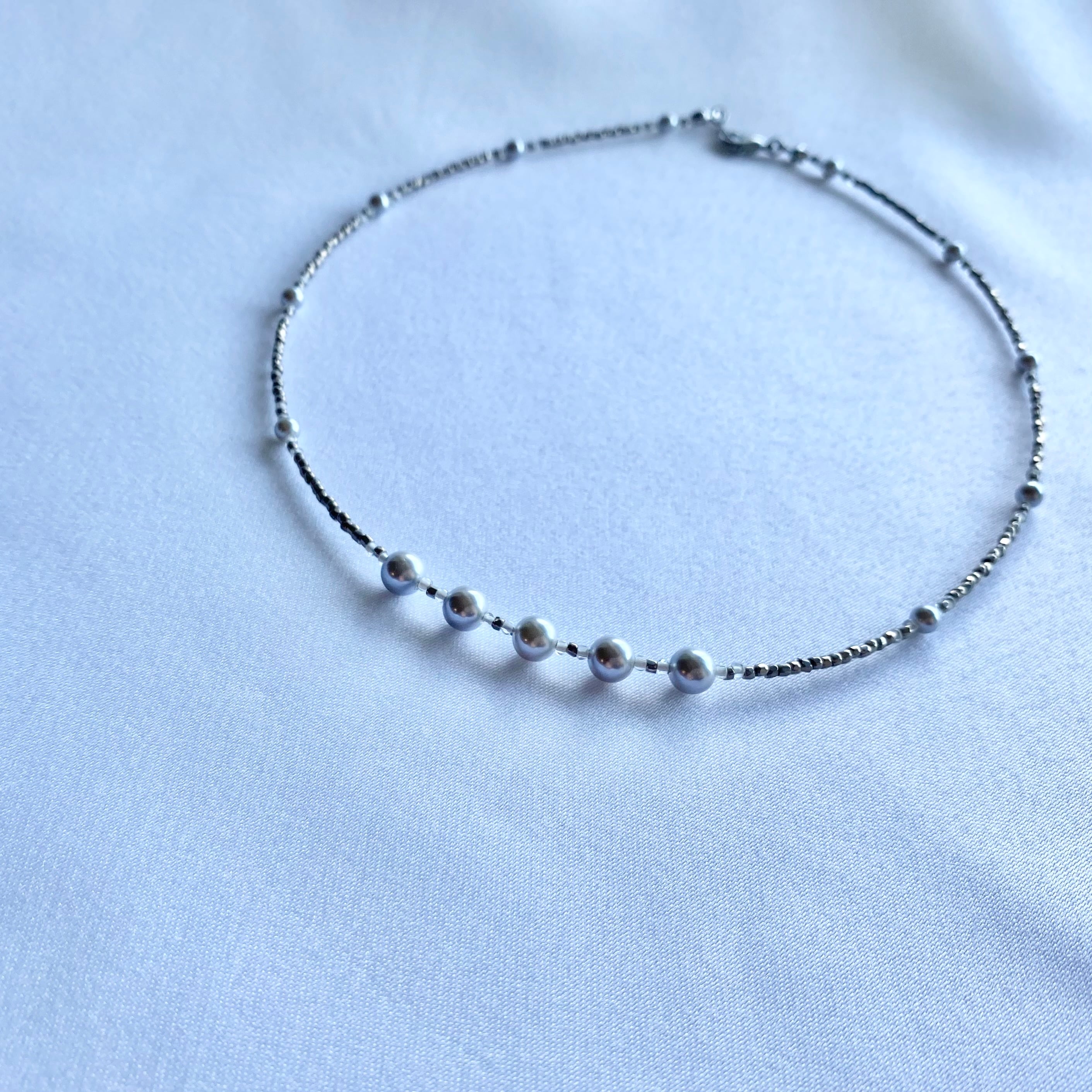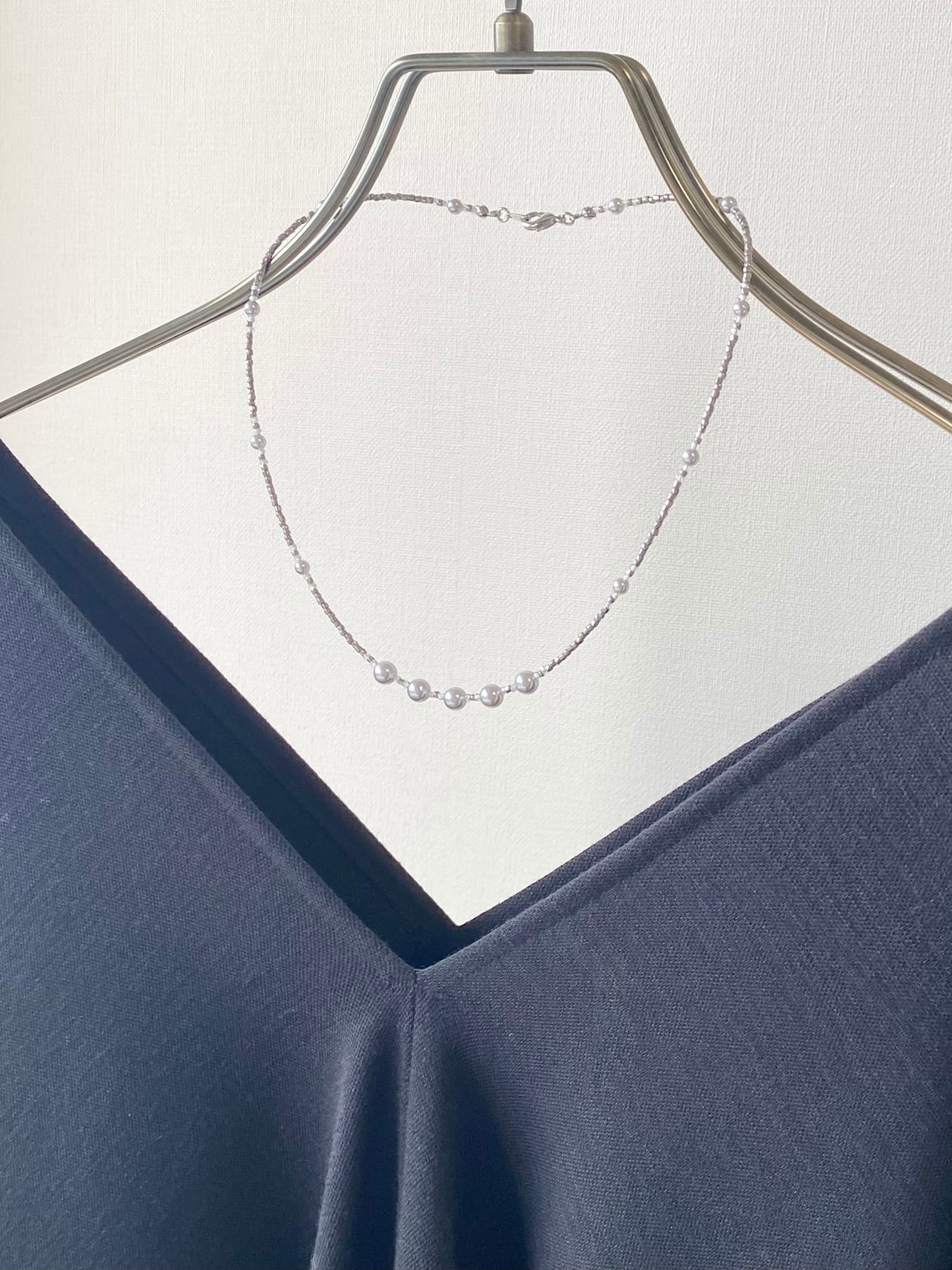 パラジウムメッキを施されたプレシャスビーズをつないだシンプルなネックレスです。